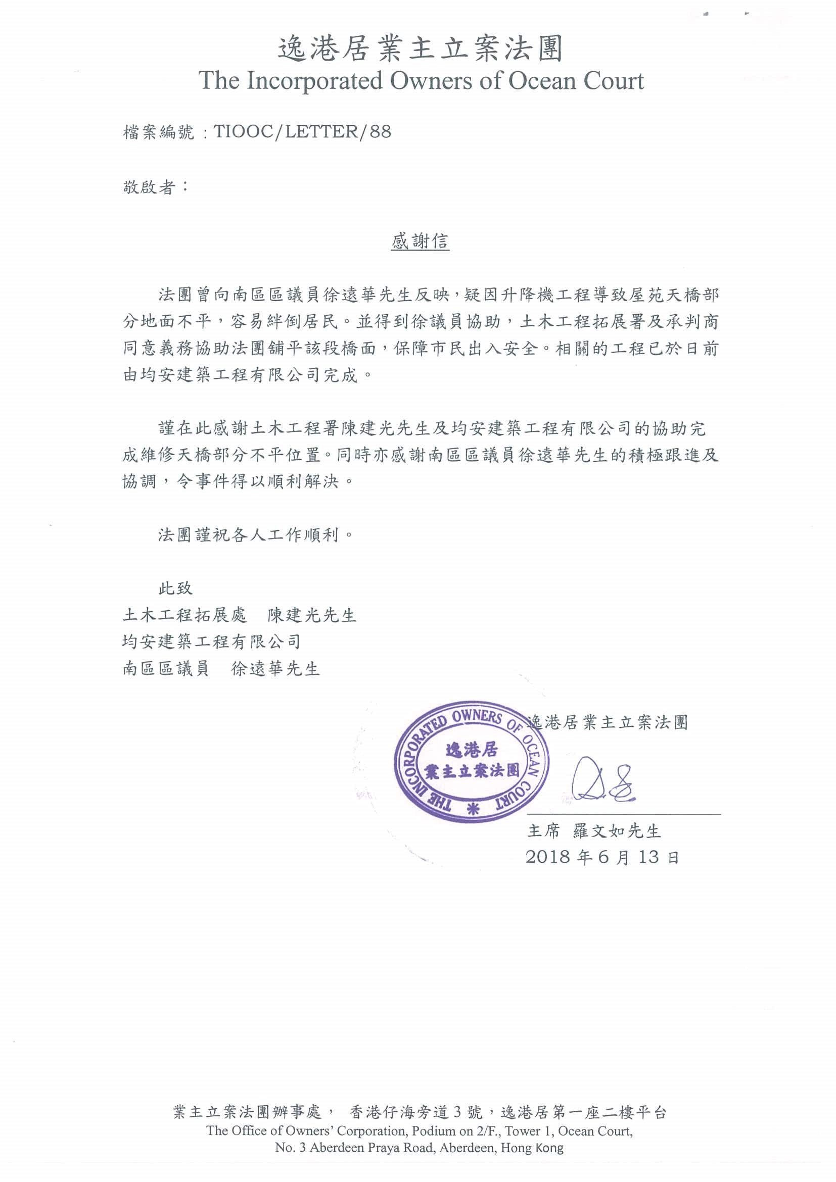 大埔区议会感谢信–合约编号:9/WSD/13(2017年3月)