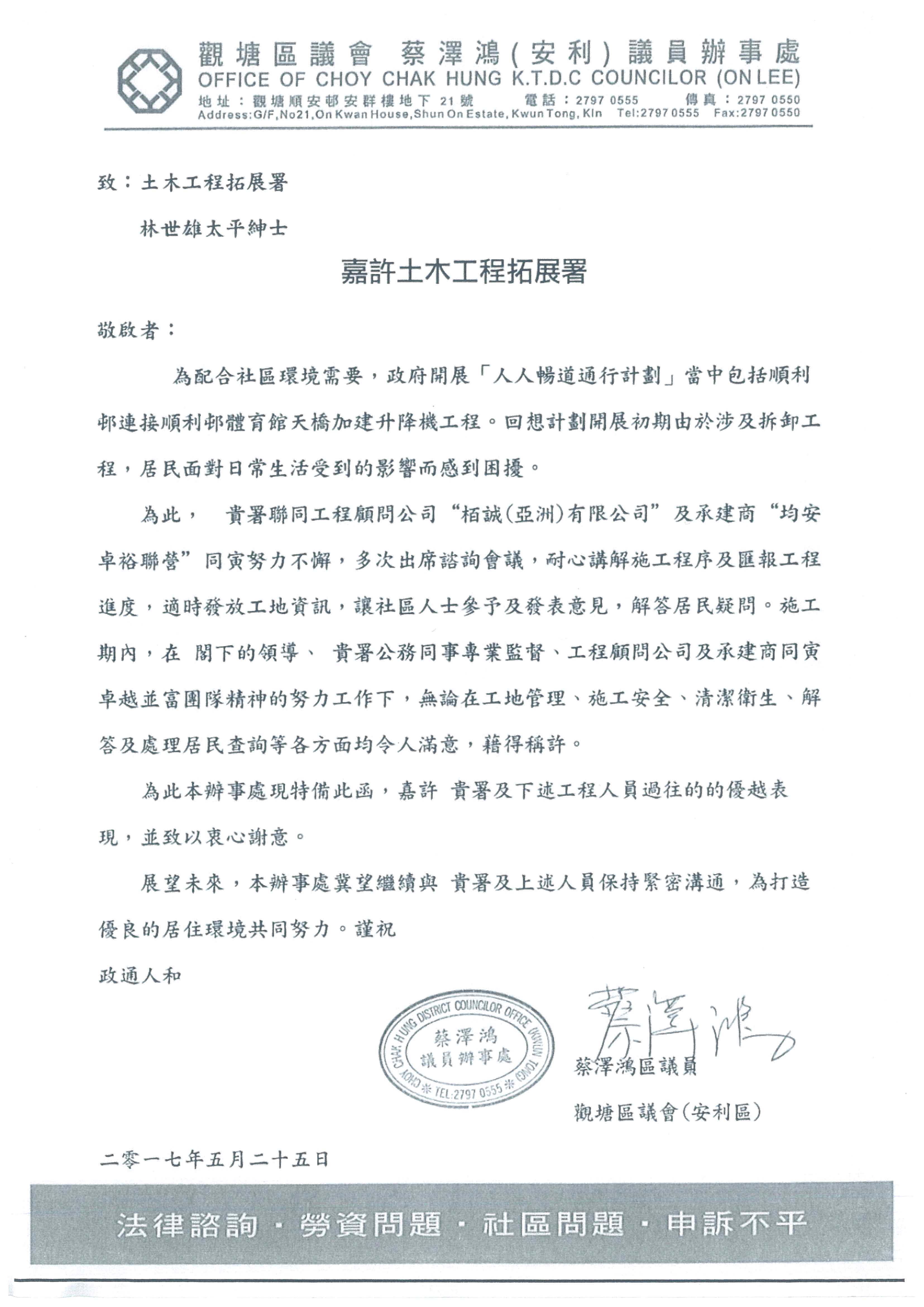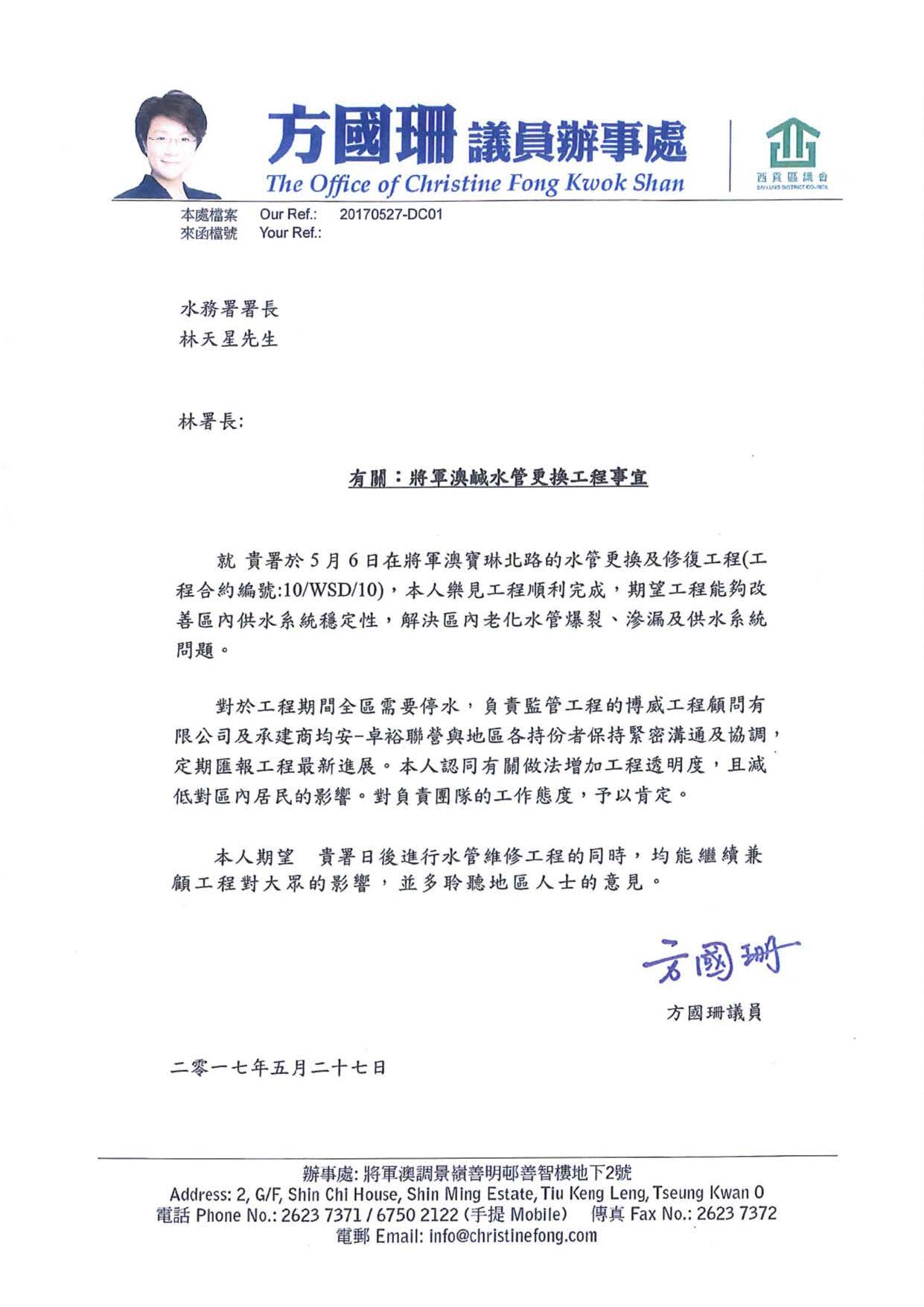 大埔区议会感谢信–合约编号:9/WSD/13(2017年3月)